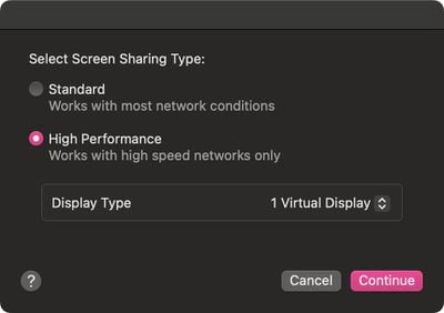 It also features a high performance mode when a screen sharing connection has been established. Click the info (i) button next to a connection, and change the Screen Sharing Type from Standard to High Performance. High performance mode allows you to use the native resolution of the host computer's display, reduces latency, improves image quality, and features HDR and multi-monitor support. The feature is available on Macs with Apple silicon running macOS Sonoma or later.