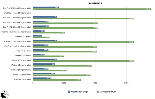 Mac Otakara shared Geekbench 5 results for the new iPad Pro that confirm about a 15-16% increase in multi-core performance over the previous model (8,516 score for 12.9-inch model with M2 chip vs. 7,326 for the 12.9-inch model with M1 chip):